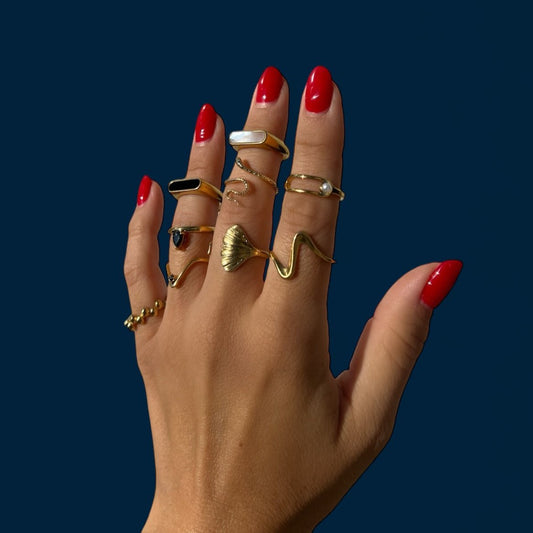This ring collection is for the art lovers, the rule breakers, and the ones who know a great hand moment is a power move. From sculptural silhouettes to sleek finishes and stone inlays, each piece feels like a little sculpture you get to wear. Stack them, mix metals, or let one bold shape do the talking.