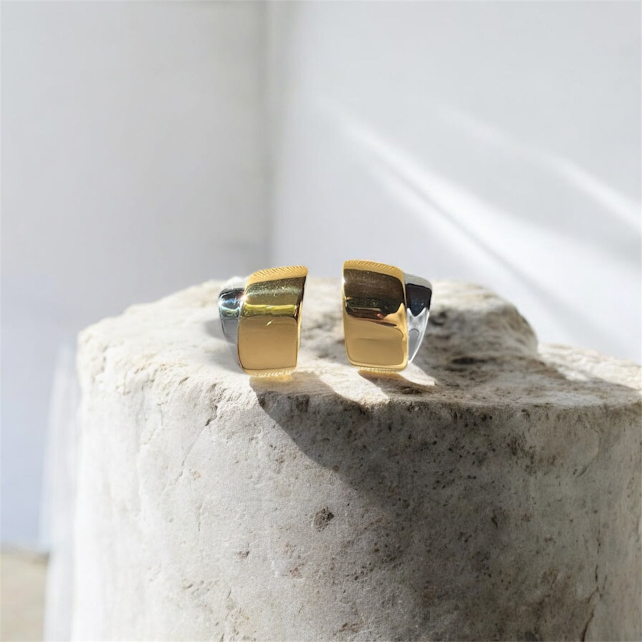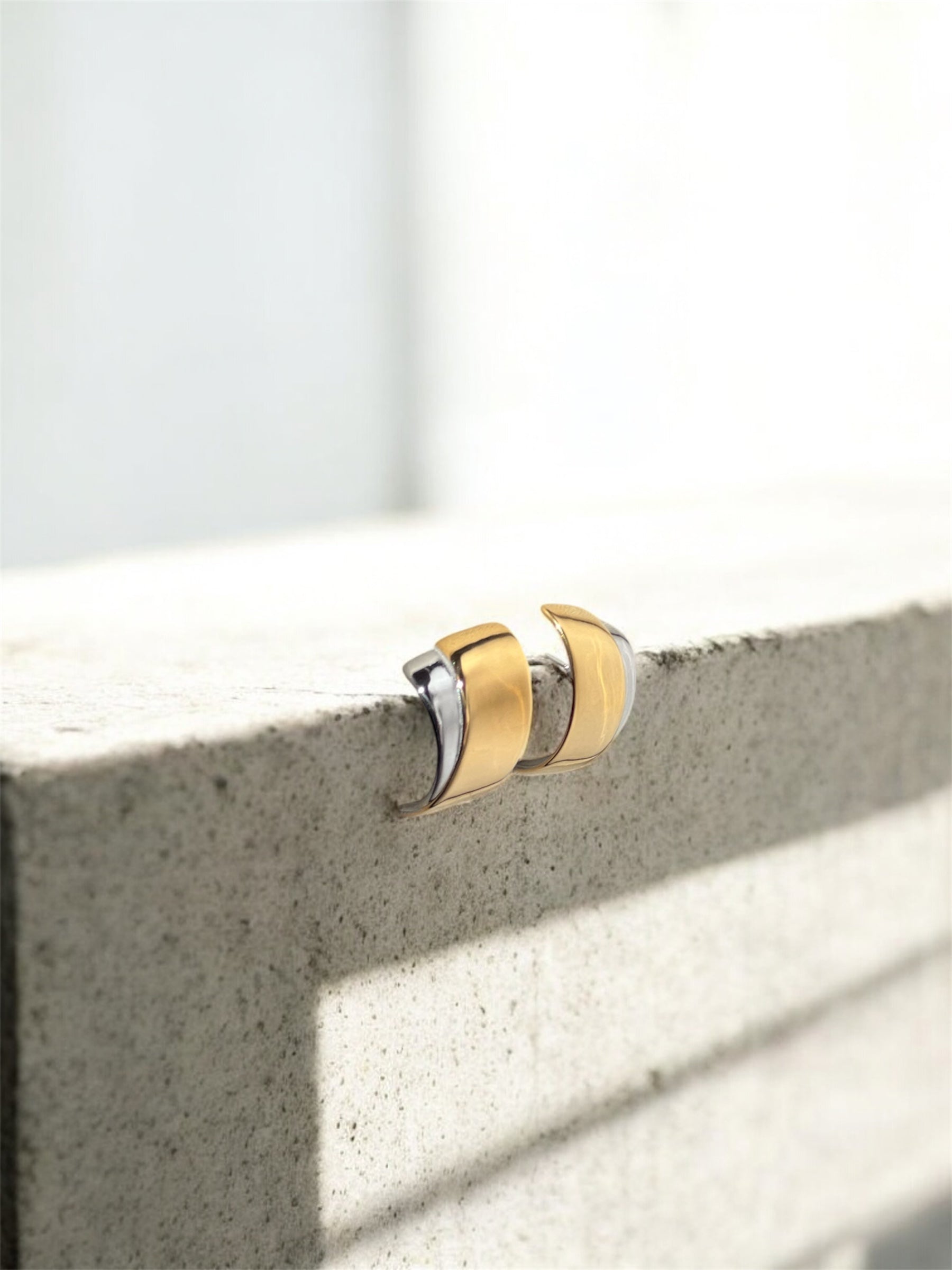 The Dua Fan Cuff Earrings are where contrast meets intention. Festuring a bold, sculptural silhouette that blends 18k gold plated stainless steel with polished silver stainless steel. Clean, minimal, and undeniably striking, these earrings are designed to elevate everything you wear.
